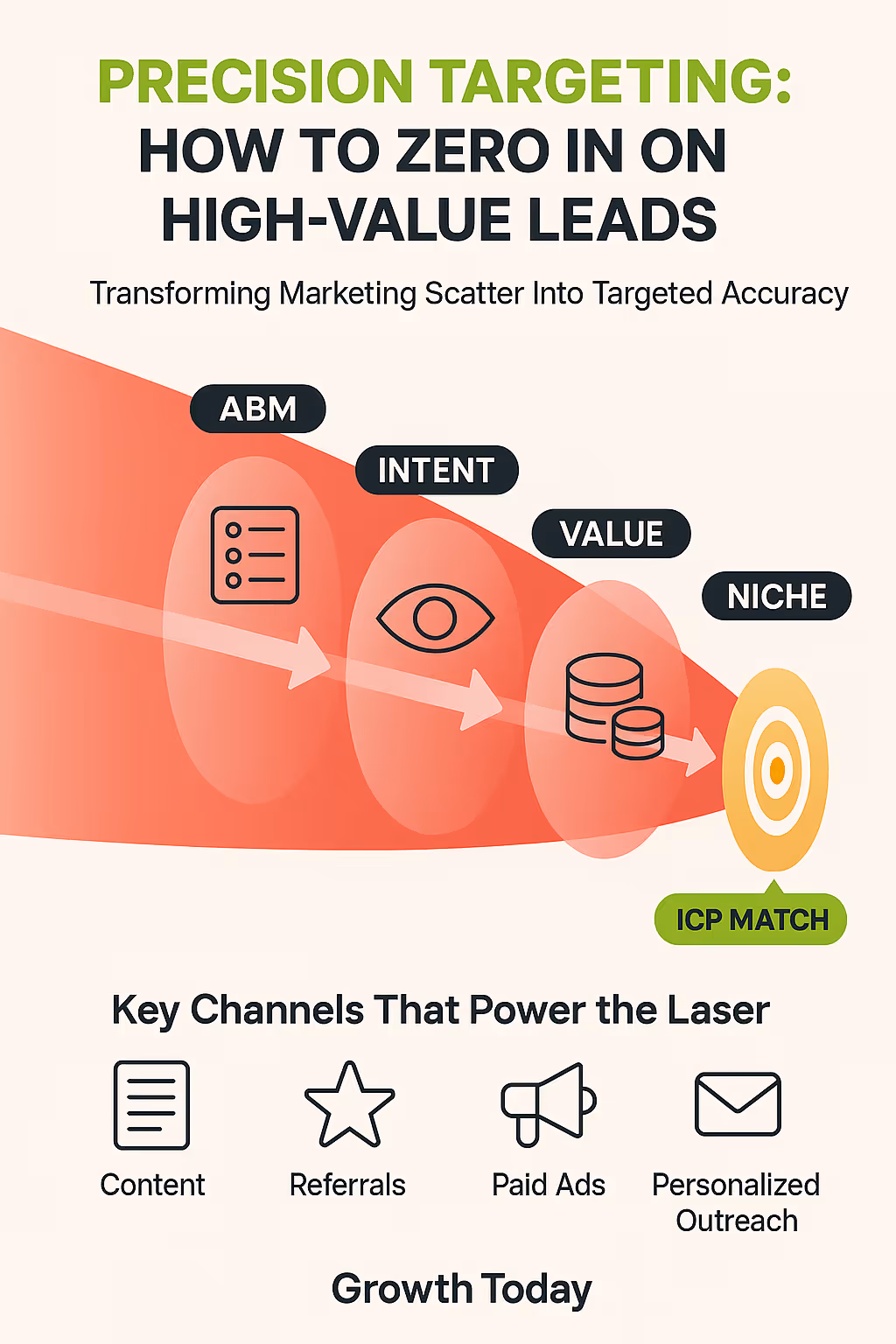Account-Based Marketing (ABM) flips the traditional funnel. Instead of casting wide, you identify a specific list of high-value target accounts matching your ICP. Then, you orchestrate coordinated marketing and sales efforts. These efforts engage key decision-makers within those specific accounts. This approach concentrates resources exclusively on prospects with the highest potential. ABM requires strong sales and marketing alignment. It also needs personalized content tailored to each target account's unique context.