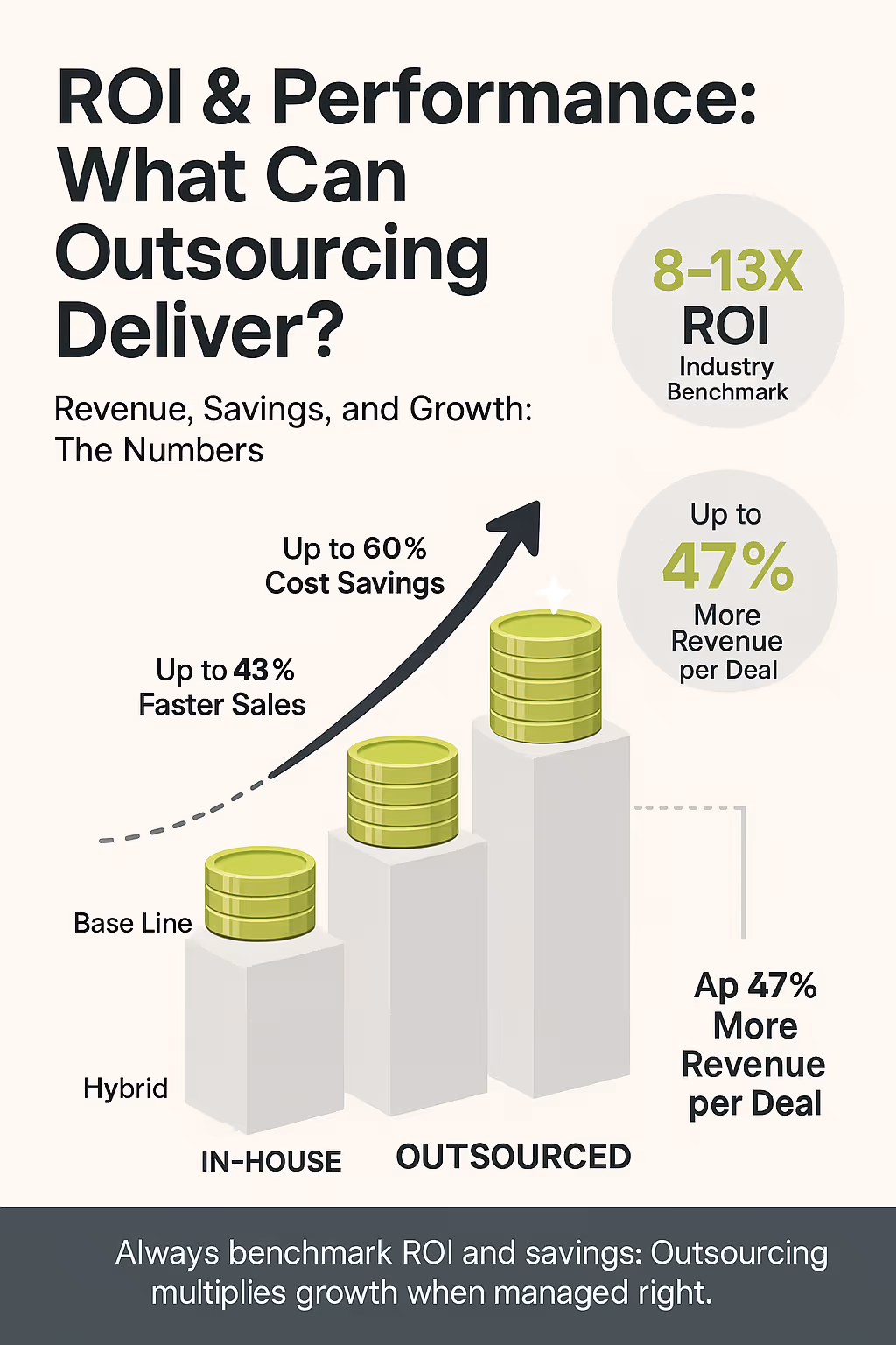 - Cost Savings: As highlighted, potential budget savings vs. fully loaded internal teams range from 30-60%, which can translate to significant capital reallocation. Specific functions like SDR programs may see 40-60% reductions. Belkins data also points to potential lead acquisition cost reductions of up to 38%. Always perform a detailed TCO analysis incorporating management and integration costs.