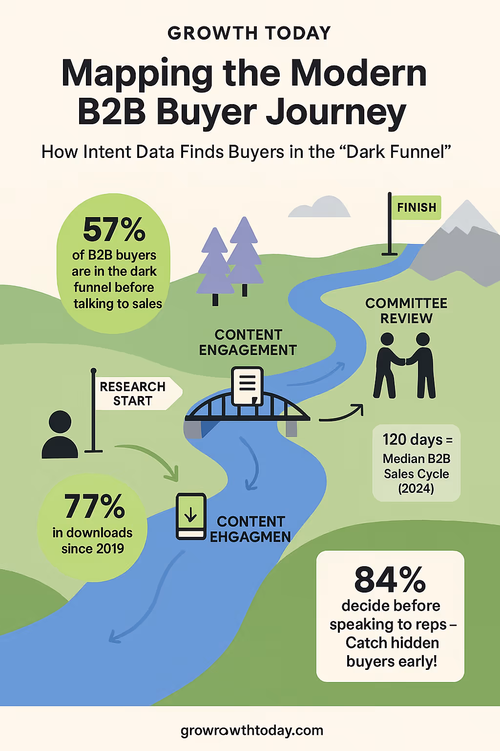 What’s really changed is how B2B buyers research. A massive 84% of B2B buyers make major buying decisions before they ever talk to a salesperson. Often, they're already as much as 57% through their purchase process before initiating contact. They do much of this research anonymously in the "dark funnel". This is why B2B buyer intent data is so crucial now – it gives you a peek into these hidden buyer journeys much earlier, helping you engage potential customers sooner. With B2B buyer journeys getting more complex, involving larger buying committees and longer decision times, timely intent data is vital.