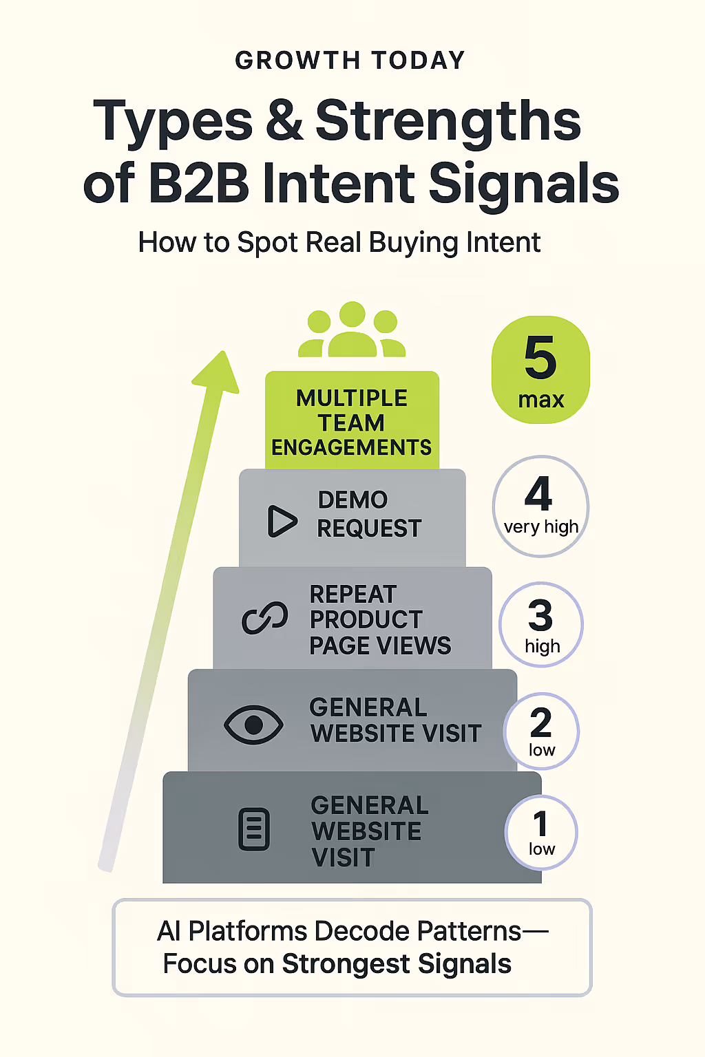 It's important to know that not all these intent signals mean the same thing. Some are much stronger indicators of buyer intent than others. For example, multiple visits to your pricing page by several people from one company show stronger buyer intent than one person reading a blog post.