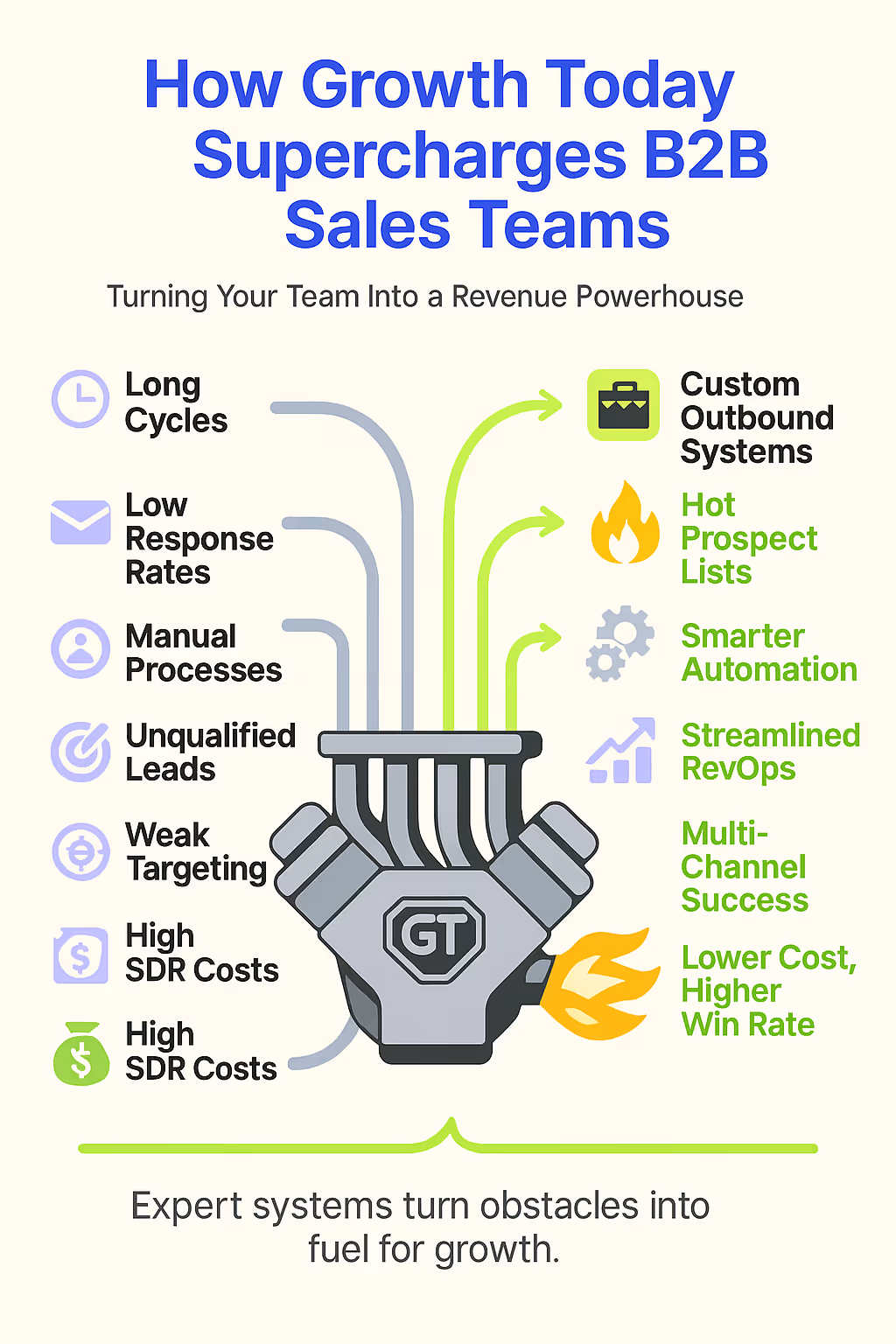 Instead of your reps getting bogged down trying to build complex outbound systems from scratch or wrestling with generic outreach that falls flat, Growth Today focuses on crafting bespoke, "dream outbound systems". Here’s how that can directly empower your sales reps: